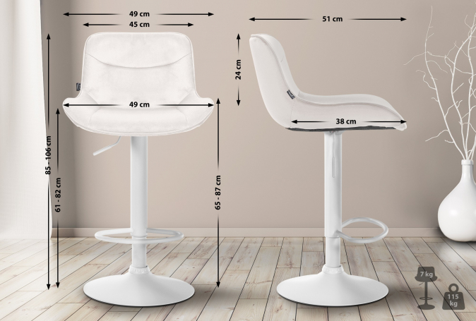 Kovový rám a trubková základna zajišťují stabilitu a odolnost. Integrovaná podnožka se přizpůsobuje výšce sedadla a poskytuje dodatečnou oporu. Sametový potah dodává barové židle elegantní vzhled a pohodlné sezení. Chrániče podlahy chrání před poškrábáním.