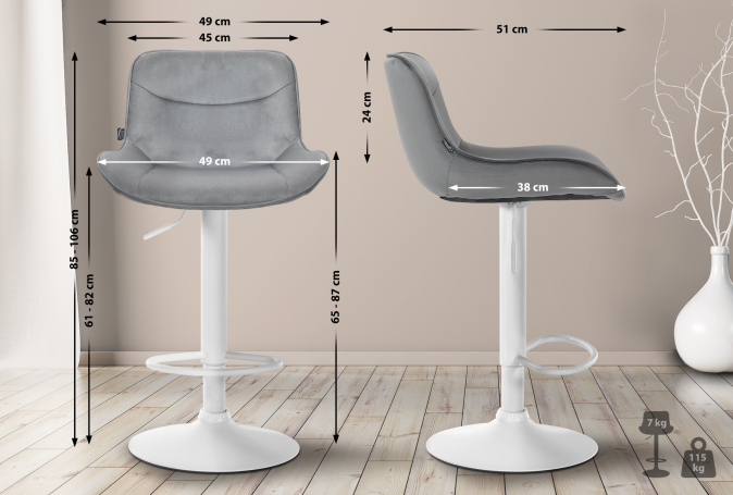 Kovový rám a trubková základna zajišťují stabilitu a odolnost. Integrovaná podnožka se přizpůsobuje výšce sedadla a poskytuje dodatečnou oporu. Sametový potah dodává barové židle elegantní vzhled a pohodlné sezení. Chrániče podlahy chrání před poškrábáním.