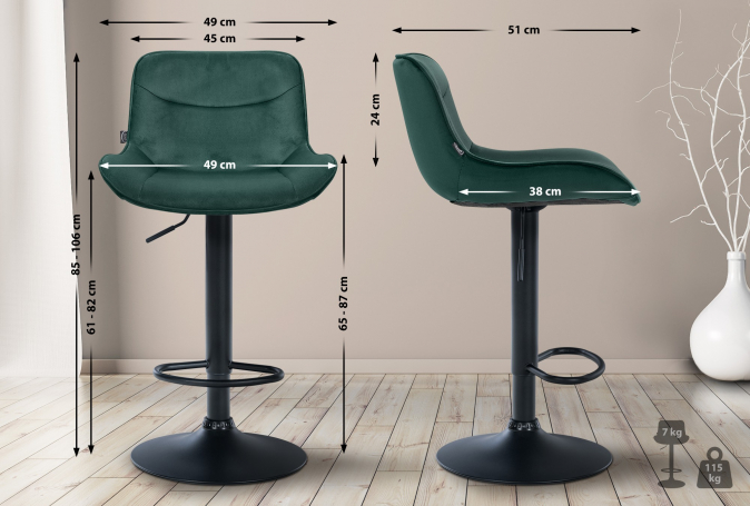 zajišťují stabilitu a odolnost. Integrovaná podnožka se přizpůsobuje výšce sedadla a poskytuje dodatečnou oporu. Sametový potah dodává barové židle elegantní vzhled a pohodlné sezení. Chrániče podlahy chrání před poškrábáním.