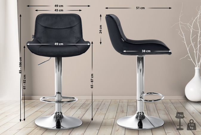Kovový rám a trubková základna zajišťují stabilitu a odolnost. Integrovaná podnožka se přizpůsobuje výšce sedadla a poskytuje dodatečnou oporu. Sametový potah dodává barové židle elegantní vzhled a pohodlné sezení. Chrániče podlahy chrání před poškrábáním.