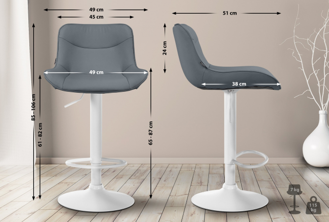 Kovový rám a trubková základna zajišťují stabilitu a odolnost. Integrovaná podnožka se přizpůsobuje výšce sedadla a poskytuje dodatečnou oporu. Sedák z umělé kůže se snadno čistí a je odolný. Chrániče podlahy chrání před poškrábáním.
