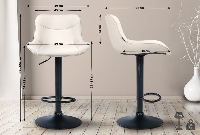 Kovový rám a trubková základna zajišťují stabilitu a odolnost. Integrovaná podnožka se přizpůsobuje výšce sedadla a poskytuje dodatečnou oporu. Sedák z umělé kůže se snadno čistí a je odolný. Chrániče podlahy chrání před poškrábáním.