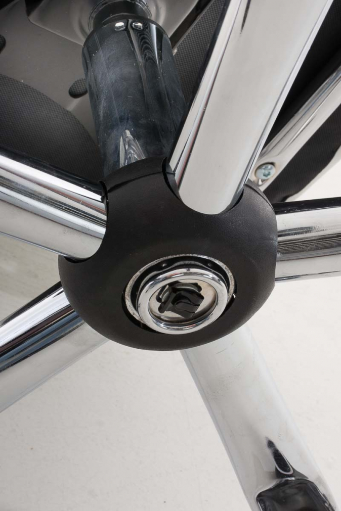 Kancelářská židle stojí na robustním kovovém rámu s pěti hladce se pohybujícími kolečky.